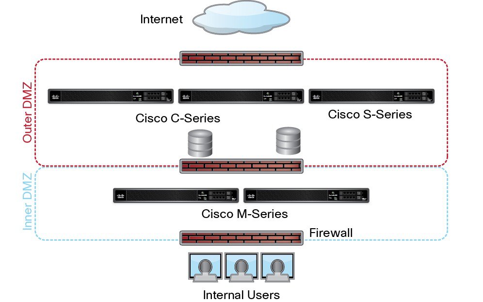 The Cisco Secure Email and Web Manager appliance lets you separate end user applications from the more secure gateway systems residing in your demilitarized zones (DMZs). Using a two-layer firewall can provide flexibility in network planning so that end users do not connect directly to the outer DMZ .