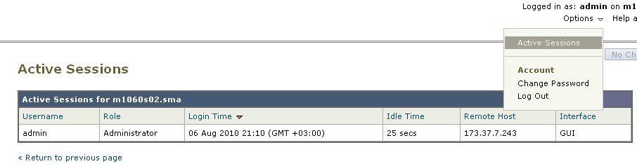 From the upper right corner of the window, choose Options > Active Sessions. ![]() From the Active Sessions page you can view the User name, what role the user has, the time the user logged in, idle time, and whether the user is logging in from the command line or the GUI. |